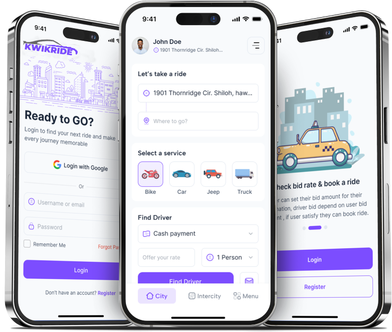 Riders enter their trip details, and drivers submit competitive bids. Riders can compare offers based on price and ratings.